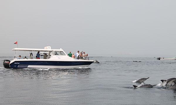 Seeing the dolphins frolicking in the waves is truly an unforgettable experience. In the light of the early morning, climb aboard a speed boat and head into the ocean to meet these amusing, intelligent and playful creatures. The dolphins are so comfortable in the warm waters of the Sea of Oman that you can see them barely 15 minutes after leaving the marina. Dolphin watching is perfect for everyone, from groups to families to couples, and even solo travellers.