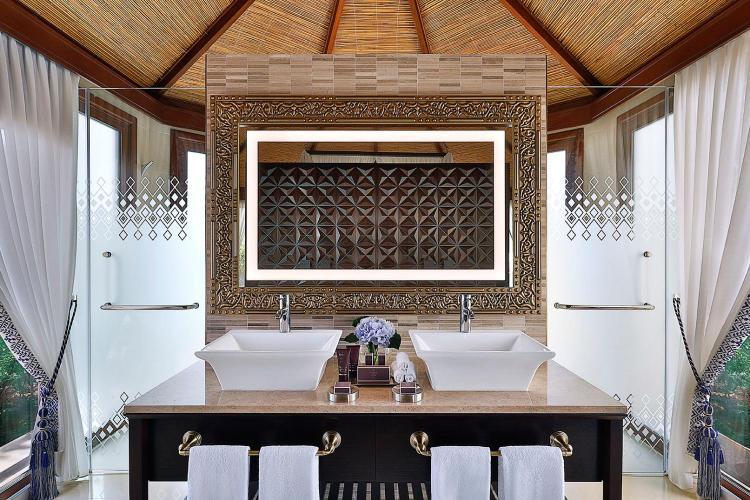 - Sophisticated villas are decked out in chic white and royal blue hues with bespoke furniture, including a vintage trunk-style minibar and entertainment unit – a television appears at the touch of a button and rotates 360 degrees for viewing from the bed or sofa. The lounge, bedroom and bathroom areas are open plan with separate cubicles for the loo and rain shower, while a huge bathtub is on the terrace along with a cabana, sun loungers, dining area and private infinity pool (with see-through glass sides).