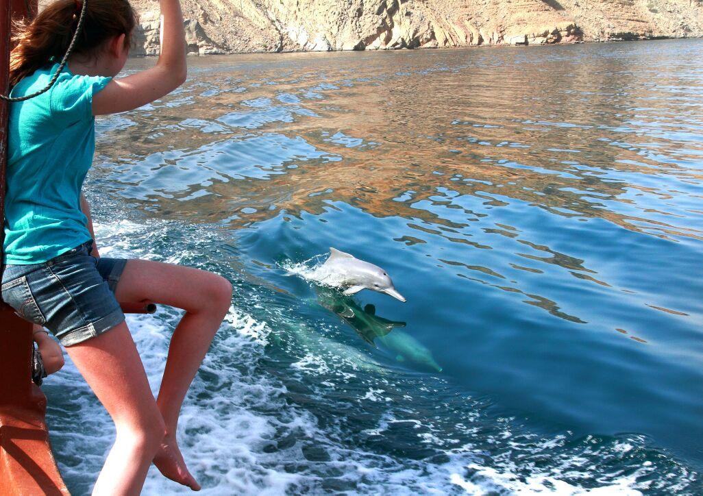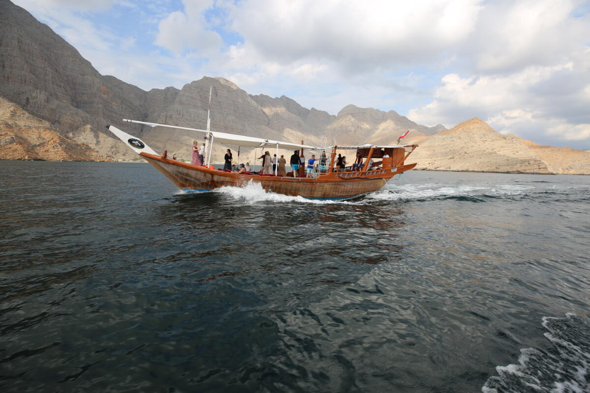 Arrive at the Khasab harbor and board the traditional Omani dhow for the Full day cruise into the spectacular, scenic and tranquil fiord, the khor as Shimm and the longest fiords in the Musandam peninsula. Observe the coastal villages as we cruise along and there’s a very good possibility to sight the playful dolphins and many other exotic marine creatures. We anchor at the famous Telegraph Island, which was a repeat station built in 1864 by the British to connect Bombay (India) with mainland Britain by an underwater and overland telegraphic cable passing via Basra in Iraq and Turkey. Enjoy swimming and snorkeling at the Telegraph Island in the pristine and calm waters of the fjord. Lunch & refreshments are served onboard. Snorkeling equipment and towels will be provided on the dhow.