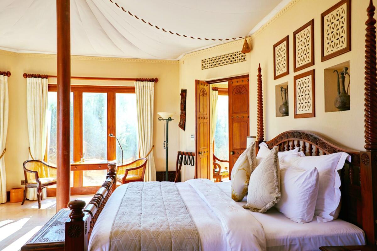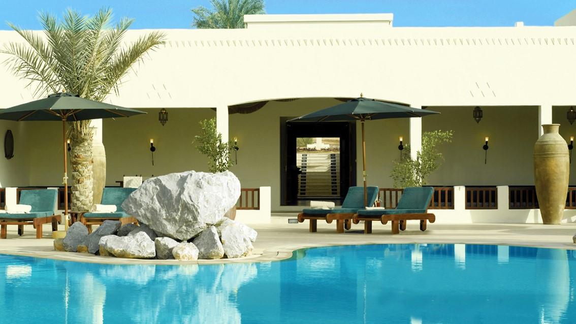 Bedouin jars for water and dates can be found at most doorways and in the beds that line the tiny road between the suites; chests sit at the end of every bed and ornate Omani doors in heavy wood are framed in glass tables.